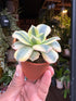 Aeonium ‘Starburst’ is a stunning, variegated succulent with wide rosettes of creamy yellow, pale green, and pink-edged leaves. Its striking colours and architectural form make it a statement plant, whether kept indoors in bright light or outdoors in a sunny, sheltered spot.