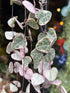 The “String of Hearts” is a trailing succulent with cream, pink, and green heart-shaped leaves. Its stem has a purple tone.