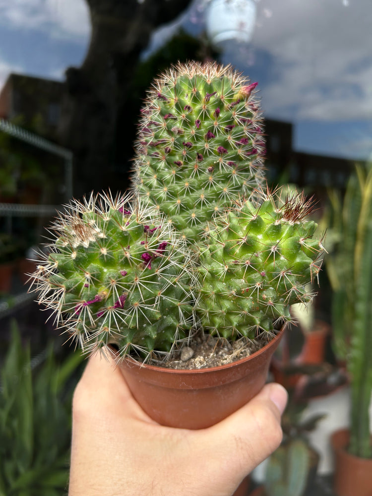 The Mammillaria Ernestii is a charming, compact cactus with dense clusters of soft, white spines that contrast beautifully with its green body. It’s a low-maintenance plant perfect for brightening up a sunny windowsill or shelf.