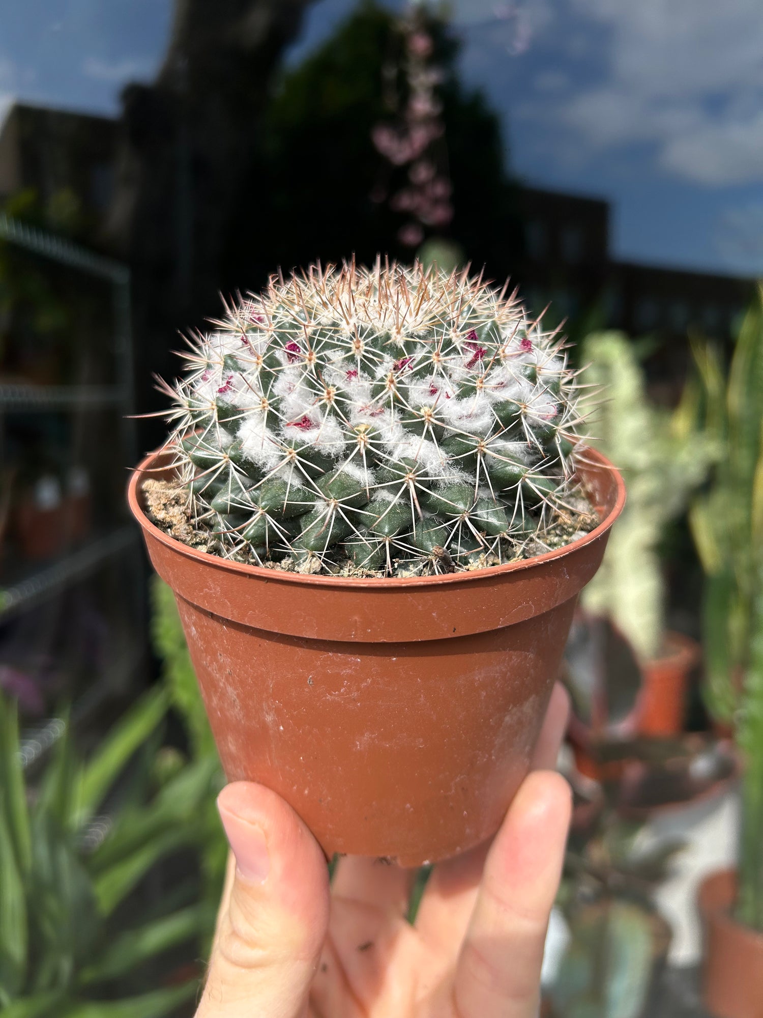 The Mammillaria polythele is a striking cactus with a columnar shape and tightly clustered, soft spines that give it a velvety look. Its compact size and sculptural form make it a stylish choice for sunny windowsills or bright shelves.