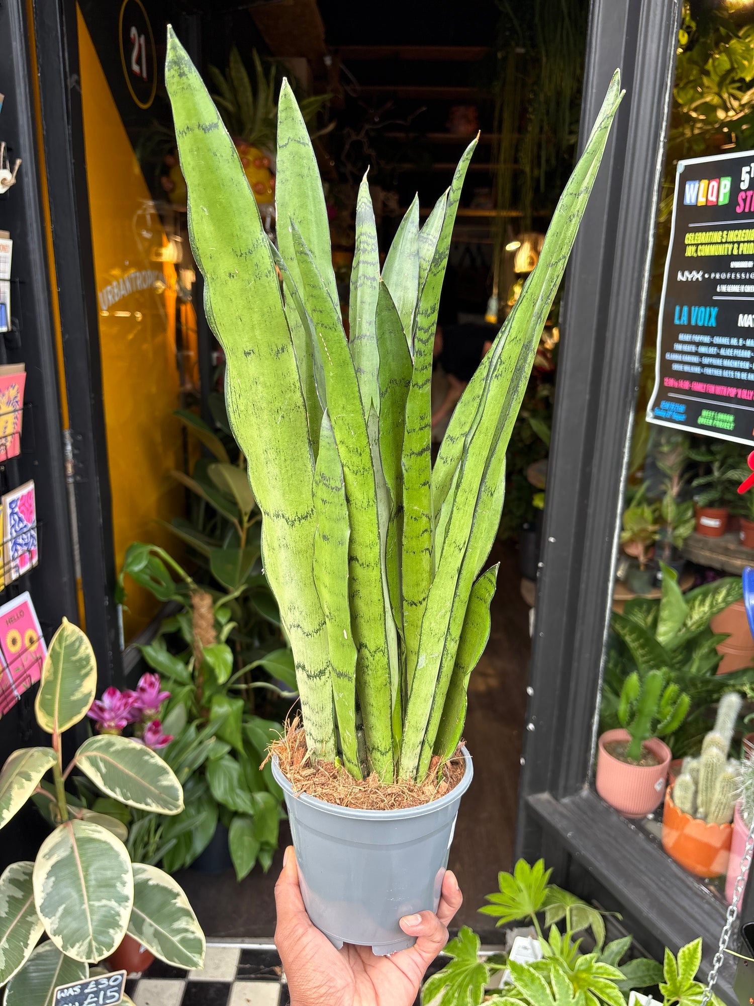 The striking variegated leaves feature a bright green centre with creamy white margins, giving this Sansevieria a fresh, modern look. It’s hardy, low-maintenance, and perfect for almost any spot in your home.