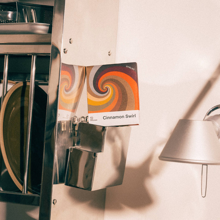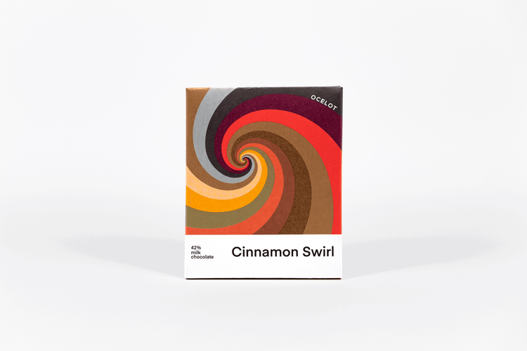 Silky 42% Esmeraldas milk chocolate blended with crisp buttery cinnamon bun, freshly baked by Wild Hearth Bakery in Perthshire. Wild Hearth are a wood-fired artisan bakery on the edge of the Scottish Highlands. Their state-of-the-art oven is fired exclusively with waste wood from timber milling, and their sourdough breads and pastries are slowly and carefully created by hand from organic flours and wild starters. Our organic 42% milk chocolate is made with rare Arriba beans from the Esmeraldas coast in Ecuador. Its rich caramel notes complete this delicious and comforting chocolate & pastry experience. Ocelot chocolate is ethical, sustainable, design forward, delicious and makes the perfect chocolate gift. Ingredients: raw cane sugar, cacao butter, whole milk powder, cacao mass, cinnamon bun (white wheat flour, butter, water, dark brown sugar, caster sugar, whole eggs, golden syrup, salt, cinnamon (0.27%)), cinnamon. Weight: 70g