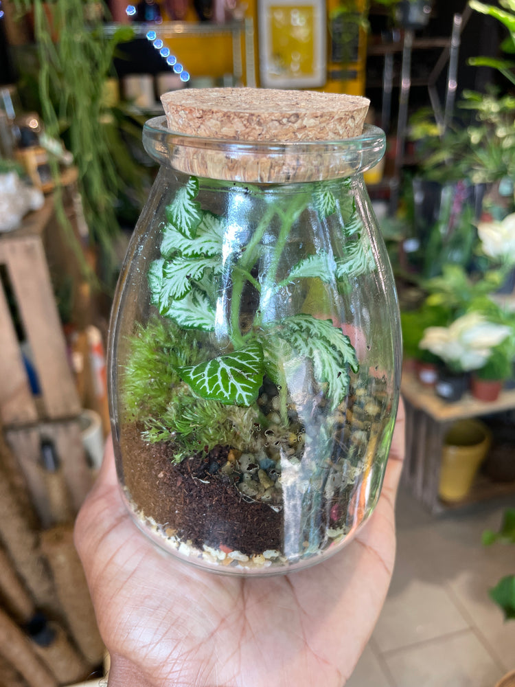 Water: Remove the cork and use a mister to spray over the top of the plants - this will only need to be done if the humidity level is low. Do not pour water directly into the terrarium.