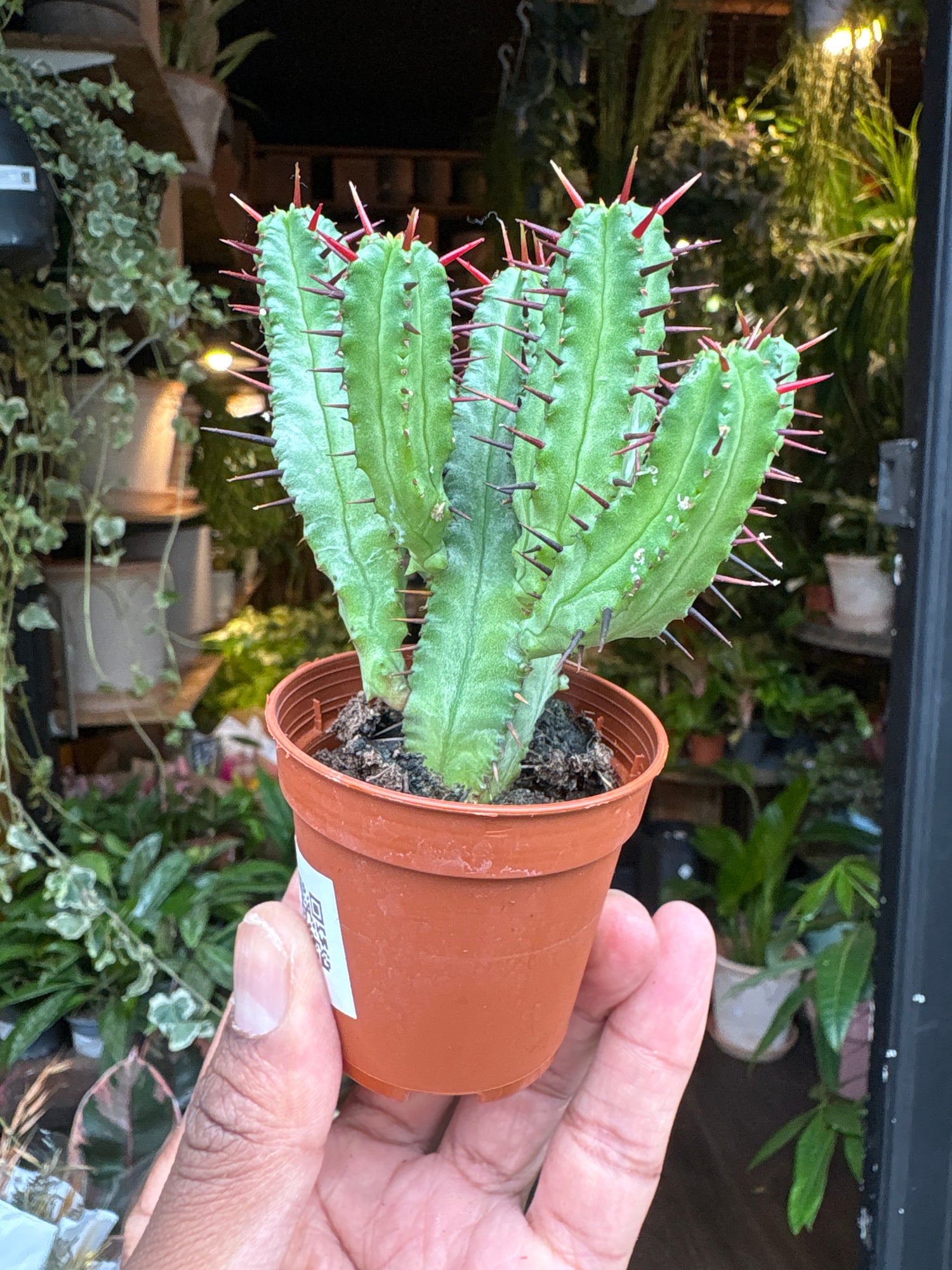 Euphorbia enopla is a much-branched succulent shrub with ribbed stems with decorative spines tightly arranged in rows along the ribs. It is from Africa and prefers to be placed in a warm space without a draft. It is also nicknamed a milk tree due to the milk like sap it produces when cut.