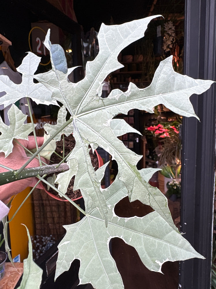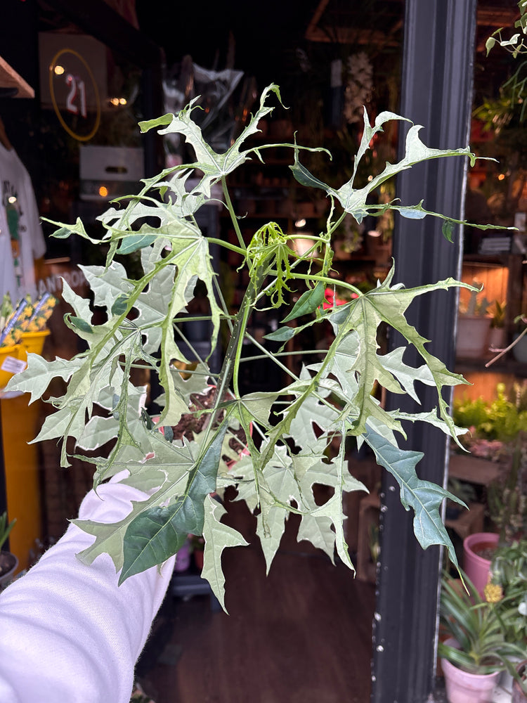 The variegated Cnidoscolus aconitifolius is a bold, tropical statement plant with large, maple-like leaves splashed in creamy white and soft green. Despite its exotic look, it’s a surprisingly fast grower that adds instant structure and brightness to a warm, well-lit space.