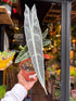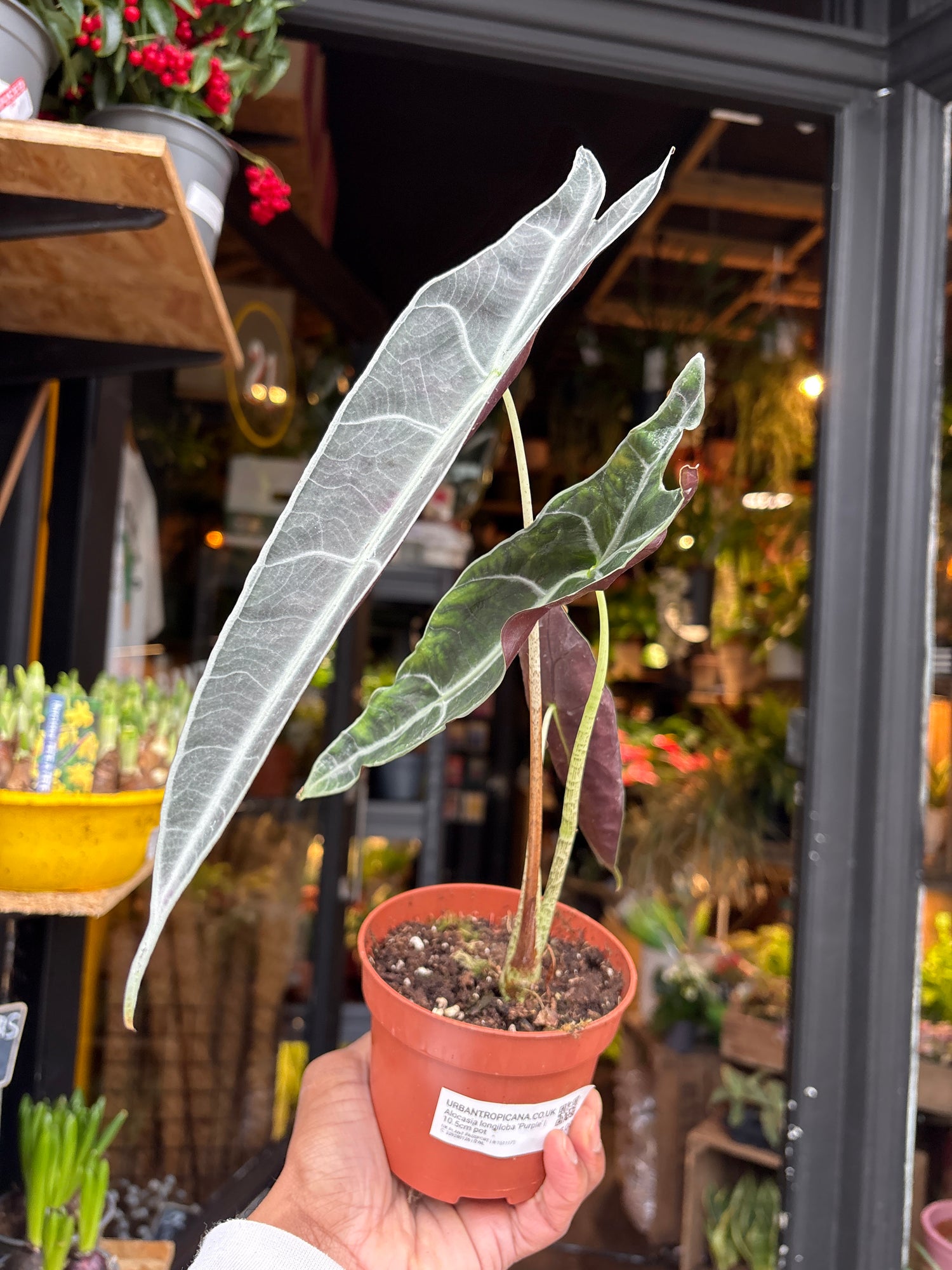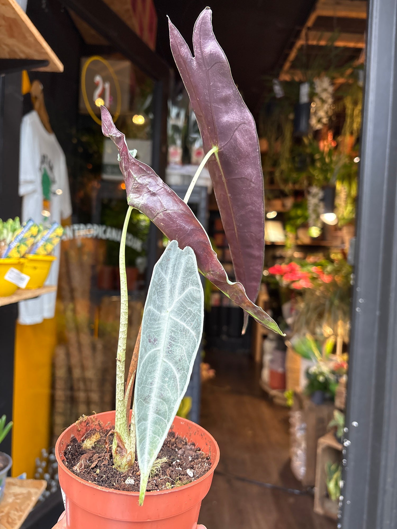 The striking, arrow-shaped leaves of Alocasia longiloba ‘Purple’ feature deep green surfaces with dramatic silver veins and rich purple undersides. This plant brings a bold, architectural look to your space and is best suited to plant lovers who enjoy a little hands-on care.