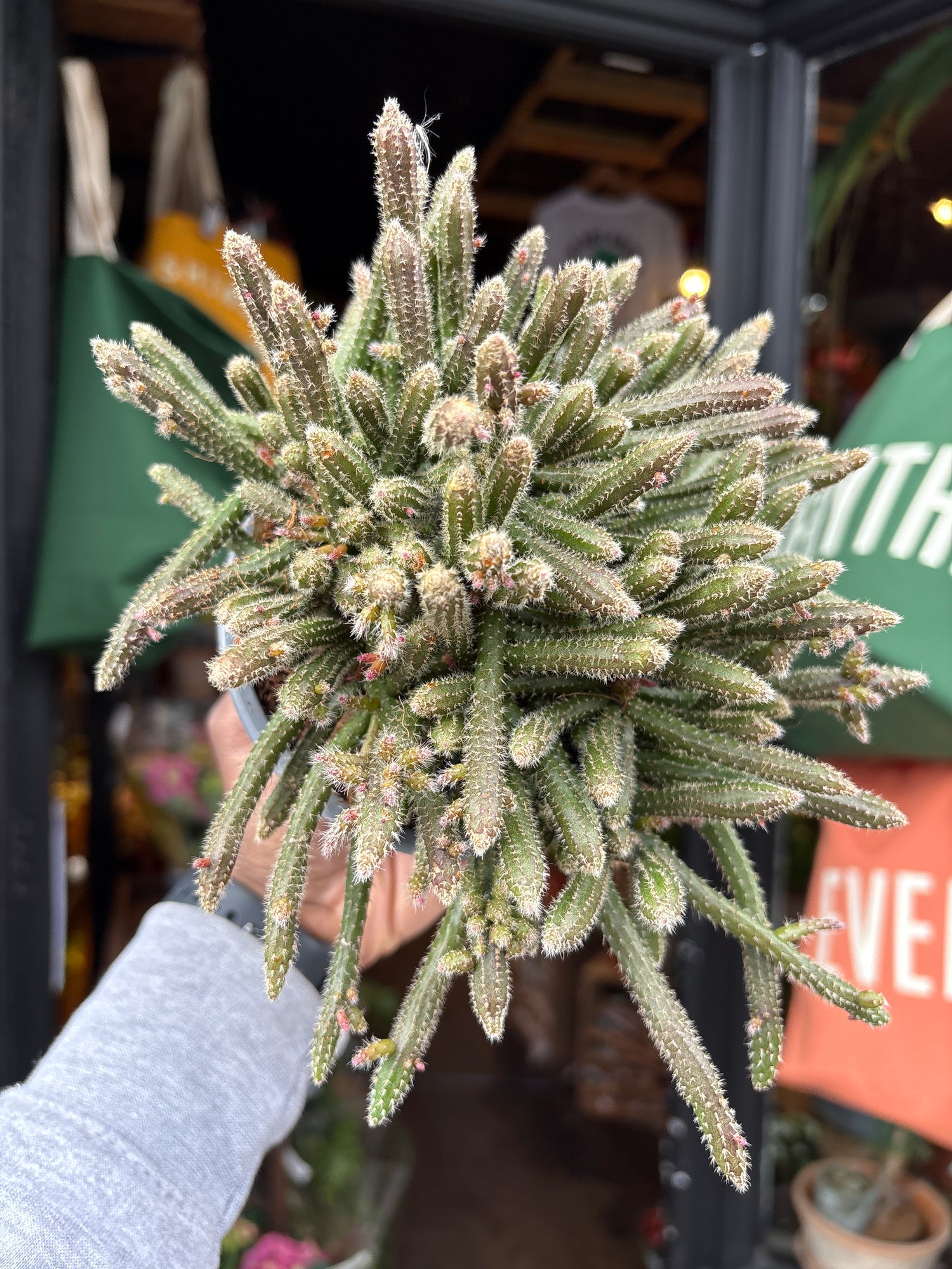 The trailing, bright green stems of this unusual cactus create a soft, cascading look that works beautifully on shelves or in hanging pots. Despite its delicate appearance, it’s a hardy and easy-going plant that adapts well to typical indoor conditions.